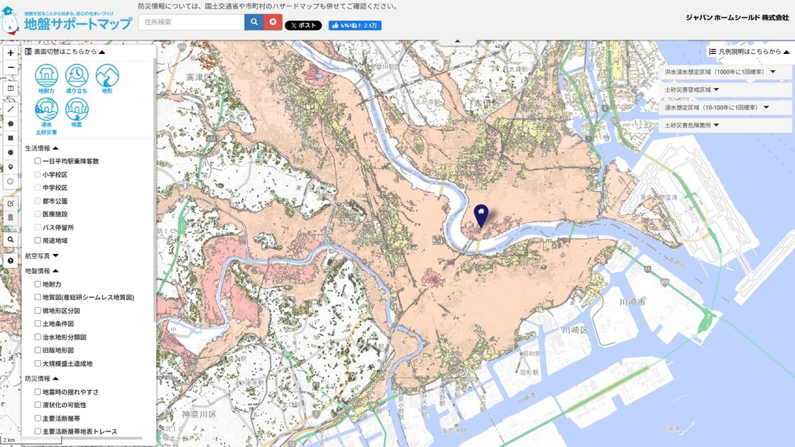 地盤リスク(地震・液状化・浸水)だけでなく、学区・公園・用途地域など、生活に関わる土地情報も確認できます。